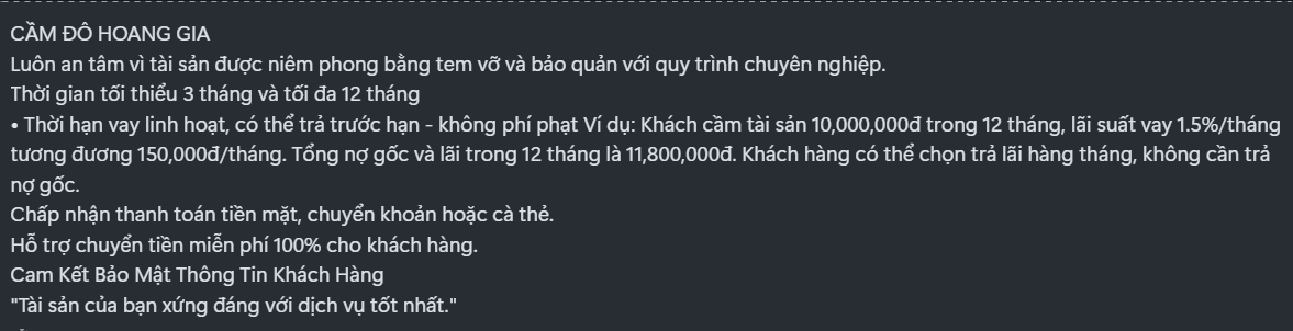 Với những ưu điểm vượt trội cùng với đó là bề dày kinh nghiệm hoạt động trong lĩnh vực cho vay thế chấp, Hoàng Gia cung cấp dịch vụ cầm đồ giá cao sẽ giải quyết được nỗi băn khoăn nên cầm trang sức ở đâu uy tín của khách hàng.